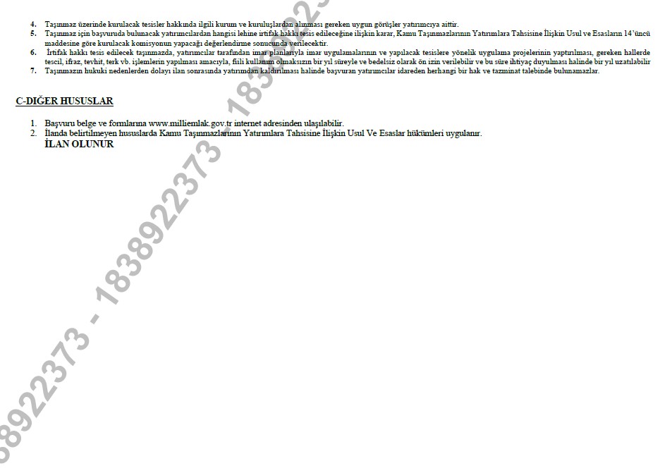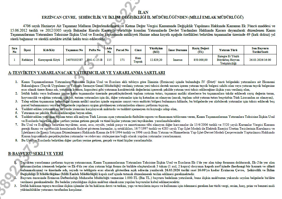 Erzincan Refahiye İlçesi Karayaprak Köyünde Bulunan Hazine Taşınmazı Yatırım Teşvik İrtifak Hakkı İlanı