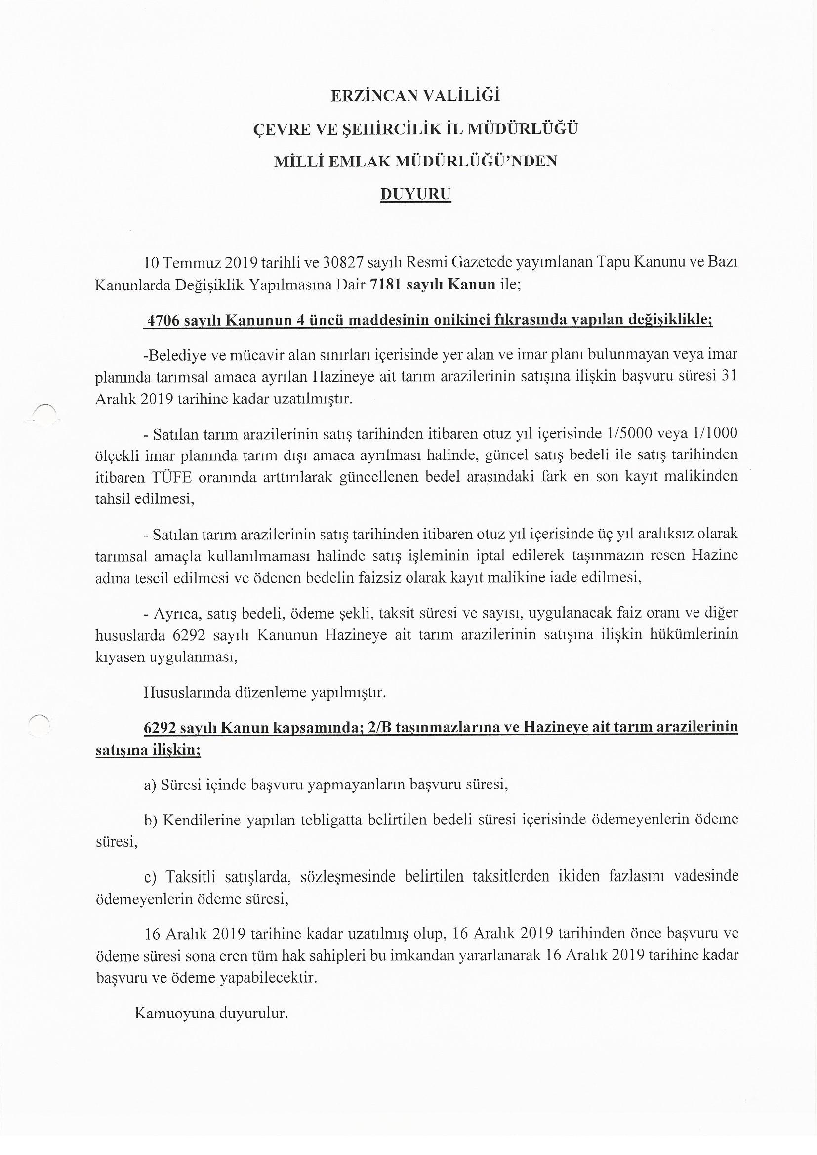 Erzincan Valiliği Çevre ve Şehircilik İl Müdürlüğü Milli Emlak Müdürlüğünden Duyuru