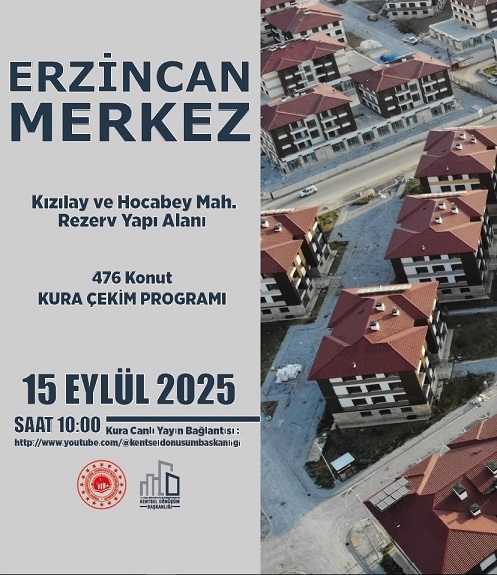 6306 sayılı Kanun kapsamında; Erzincan İli, Merkez İlçesi, Kızılay-Hocabey Rezerv Yapı Alanı Kentsel Dönüşüm Projesi kapsamında yapımı tamamlanan konutların Konut Belirleme Kurası: 15 Eylül, 2025 Pazartesi günü, saat 10:00’da Kentsel Dönüşüm Başkanlığı tarafından Noter huzurunda ve www.youtube.com/@kentseldonusumbaskanligi adresinden naklen yayınlanmak suretiyle yapılacaktır.